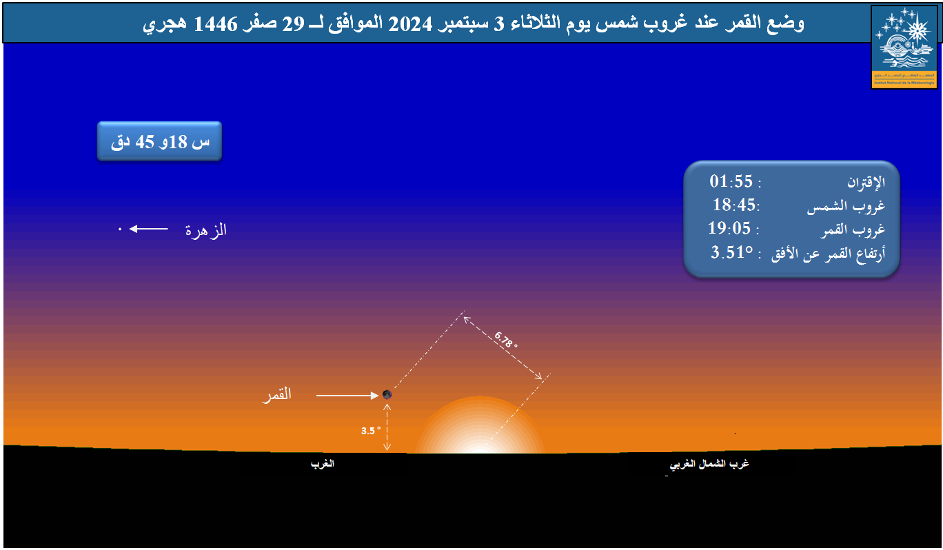 صورة 1 : وضع القمر بالأفق الغربي بمدينة تونس وذلك عند غروب الشمس يوم الثلاثاء 03 سبتمبر 2024 الموافق لــ 29صفر 1446 هجري