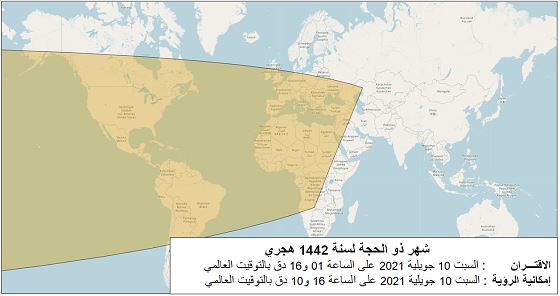 صورة 2: مناطق إمكانية رؤية هلال بداية شهر ذو الحجة لسنة 1442 هجري بعد غروب شمس يوم السبت 10 جويلية 2021 في العالم.