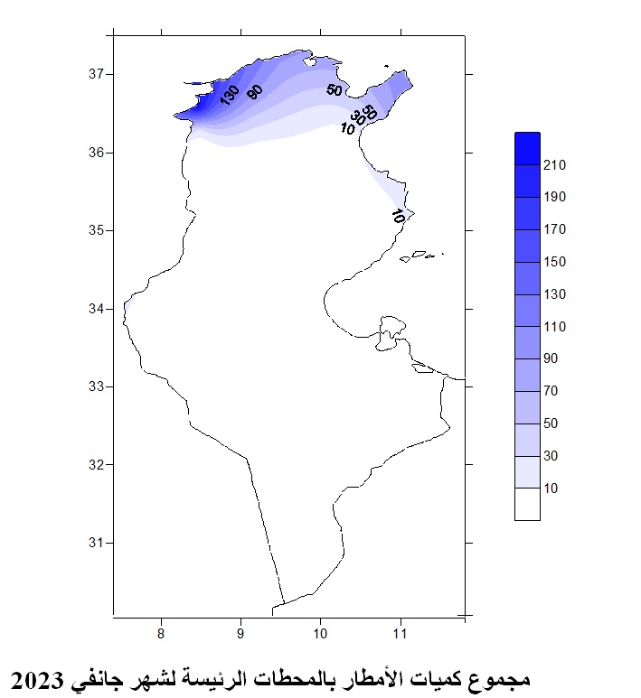 في ما يتعلق بالأمطار، كان هطولها غير متجانس للغاية ، أقلّ من المعتاد بأغلب المناطق وقريبًا من المجموع المرجعي ببنزرت وفاق المعدّل المرجعي بطبرقة وقليبية. ولقد بلغ المجموع الإجمالي (27 محطة رئيسة) للشهر 580.6 مليمترا في حين كان المعدل الطبيعي لنفس المحطات 1122.8 مليمترا و بلغت بذلك نسبة النقص عامّة 48 % .